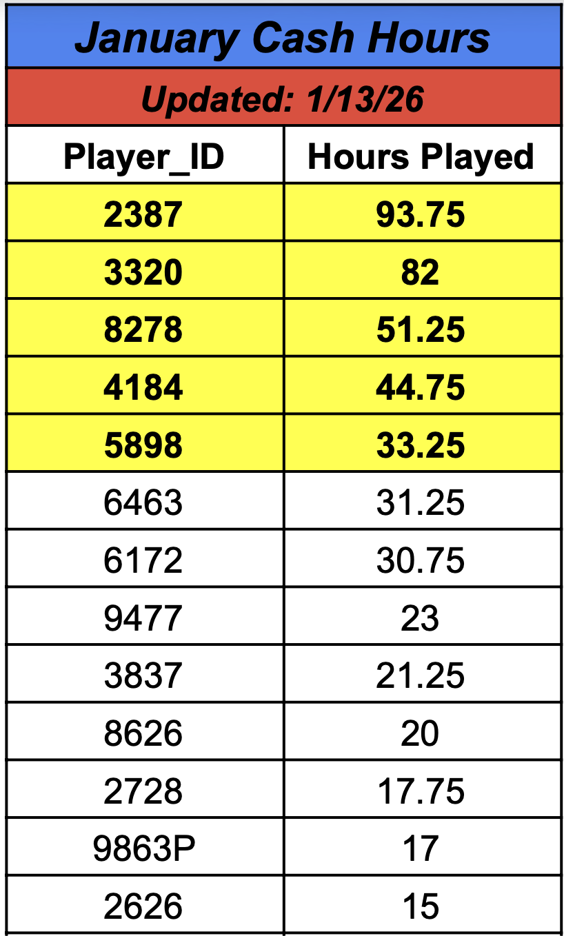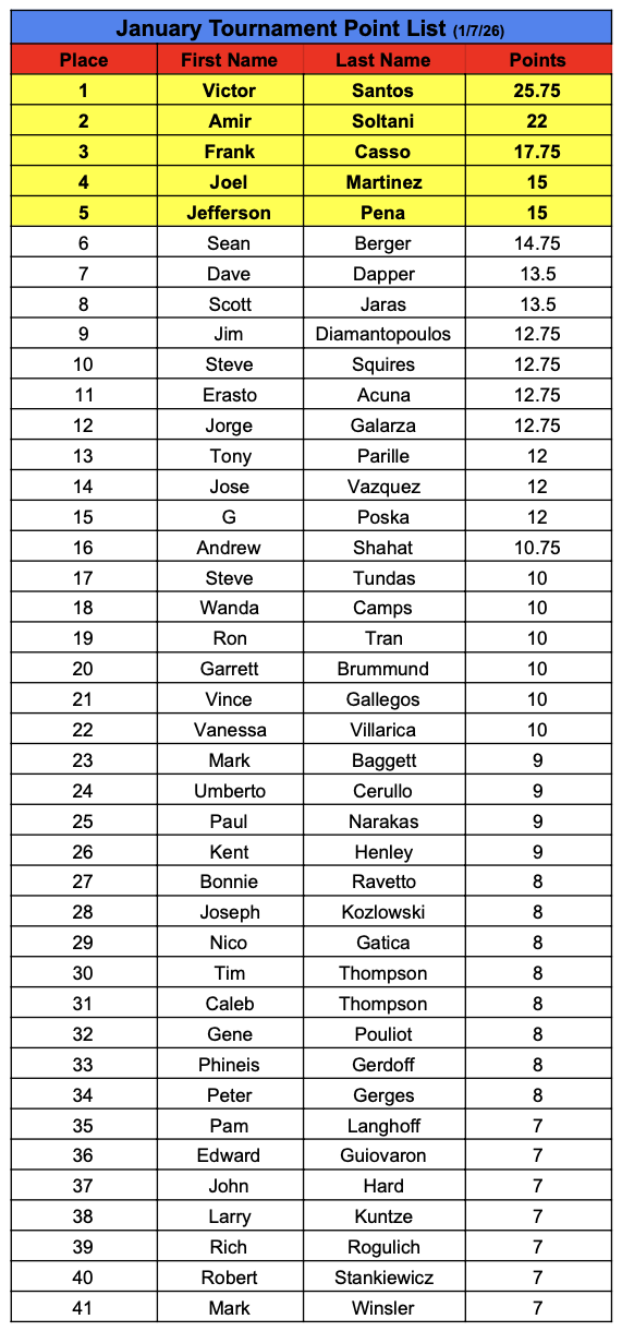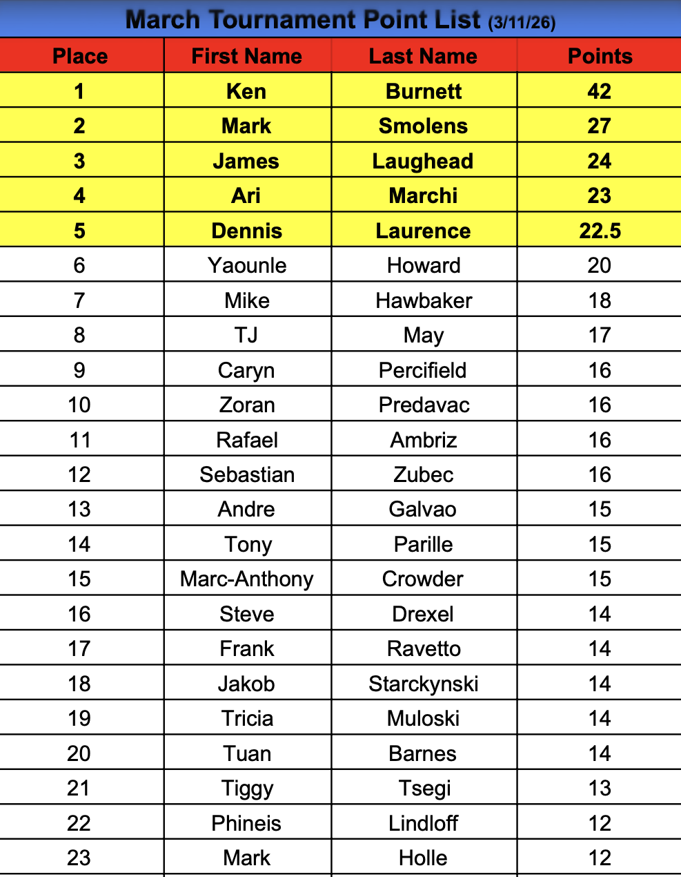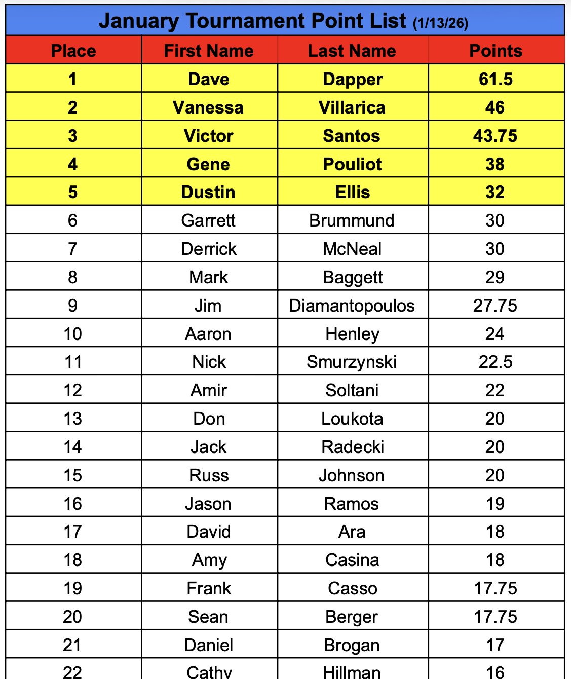 Please text Ken at (630) 901-9797 if you have any questions about your points totals, or if you believe your points totals are incorrect. All points corrections must be made before the next update. We are unable to go back more than one weekend to correct points.