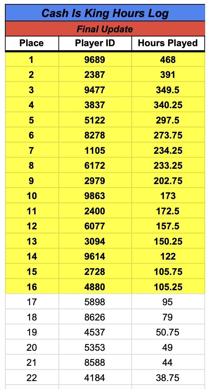 Who will be crowned the Cash King and take home the largest chunk of the $15,000 Cash is King promotional giveaway? The top 16 cash game players on our Cash is King points list will earn a seat in the $15K Cash is King Giveaway! Earn one point for every hour of cash game you play. All you have to do is check in at the bank when you buy chips and when you cash out!
