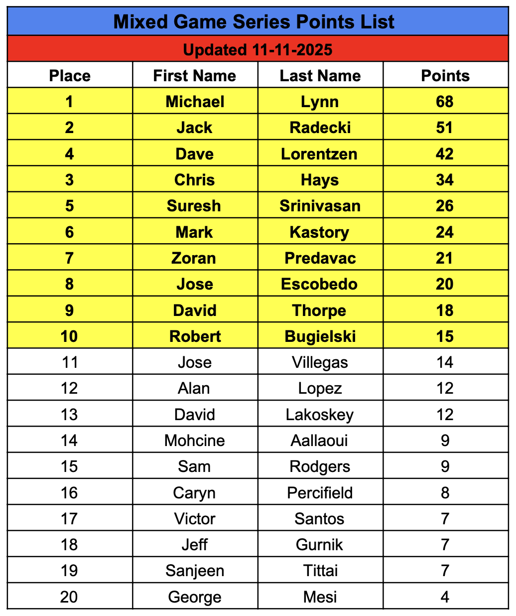The top 10 points leaders will earn a seat into the $300 Players Championship courtesy of CCG poker and its hosting charities. Earn points by finishing in the top five of the Mixed Series events. There are no points multipliers in this series.